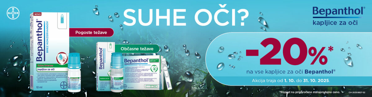 Suhe oči nastanejo zaradi nezadostnega ali slabše kakovostnega solznega filma, kar povzroča draženje, pekoč občutek in občutek peska v očeh. Bepanthol kapljice za oči vsebujejo dekspantenol in hialuronsko kislino, ki vlažita in pomirjata oči ter podpirata obnovo površine očesa. Redna uporaba kapljic lajša simptome suhih oči ter izboljšuje udobje pri nošenju kontaktnih leč ali delu z računalnikom. Izbrani izdelki z dodatnim 20 % popustom.