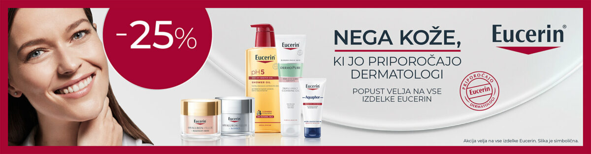 Eucerin je dermatološka blagovna znamka, znana po svojih izdelkih za nego občutljive in problematične kože. Njeni izdelki temeljijo na znanstvenih raziskavah in so pogosto priporočeni s strani dermatologov. Ponuja rešitve za težave, kot so suha koža, atopijski dermatitis, akne in pigmentni madeži. 25% popust na vse izdelke, se avtomatsko obračuna v košarici.