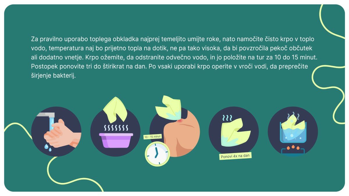 Za pravilno uporabo toplega obkladka najprej temeljito umijte roke, nato namočite čisto krpo v toplo vodo, temperatura naj bo prijetno topla na dotik, ne pa tako visoka, da bi povzročila pekoč občutek ali dodatno vnetje. Krpo ožemite, da odstranite odvečno vodo, in jo položite na tur za 10 do 15 minut. Postopek ponovite tri do štirikrat na dan. Po vsaki uporabi krpo operite v vroči vodi, da preprečite širjenje bakterij.