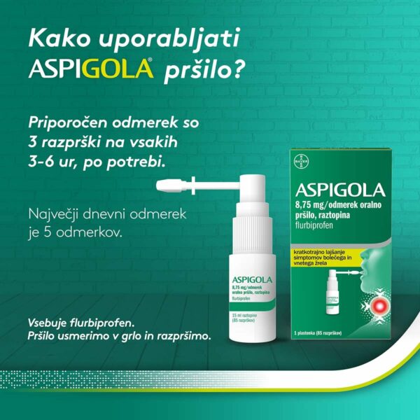 Zdravilo Aspigola oralno pršilo razpršite samo na zadnji del žrela. Zdravilo Aspigola je priporočljivo uporabljati največ tri dni.