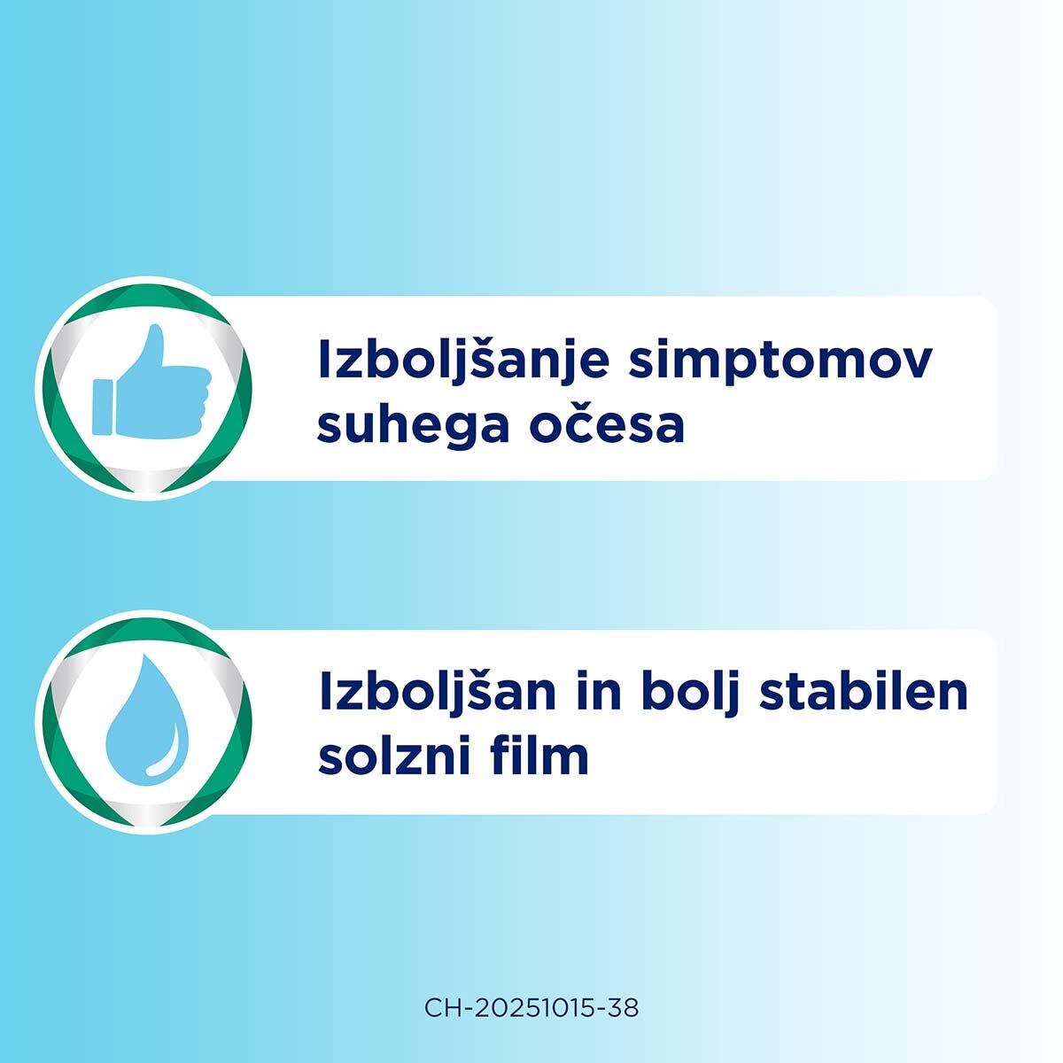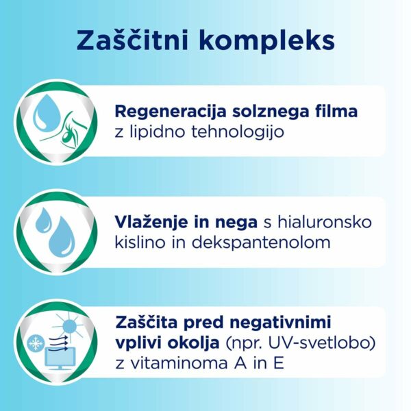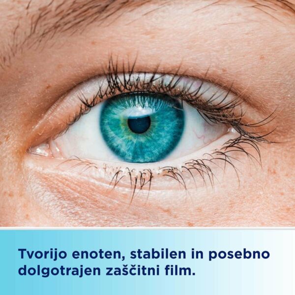 - Poseben aktivni kompleks vsebuje dekspantenol (provitamin B5), ki zaradi svoje visoke sposobnosti vezave vode lahko opazno ublaži simptome suhih oči, navlaži in dodatno neguje oči.