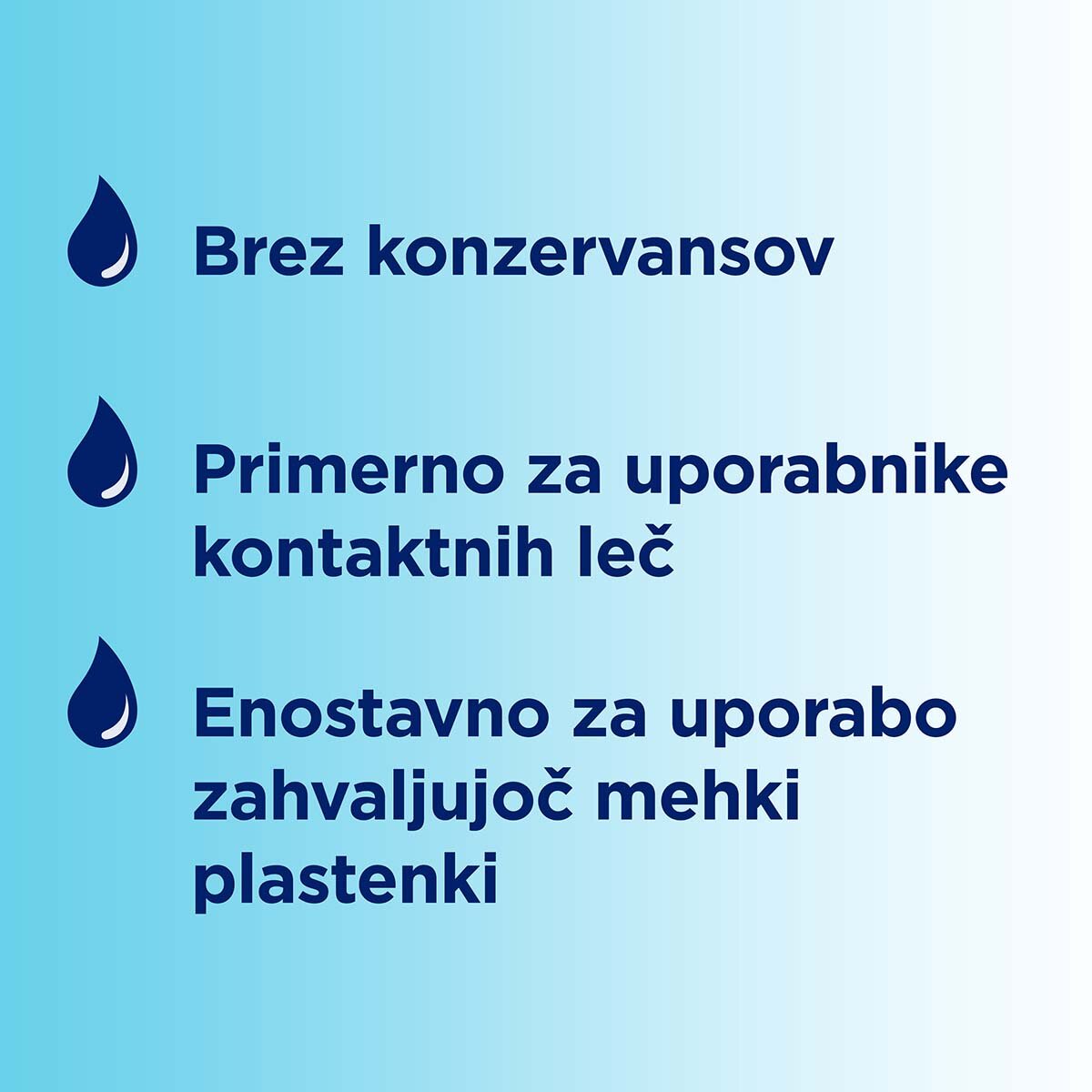 So sterilne, brez konzervansov in s posebnim aktivnim kompleksom, ki vsebuje lipide, hialuronsko kislino, vitamin A ter vitamin E – za zaščito in vlaženje površine očesa, brez poslabšanja vida.