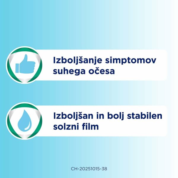 - Poleg tega kapljice za oči vsebujejo še vitamin A, vitamin E, fosfolipide, karbomer in glicerol. Vitamin A in vitamin E imata antioksidativni učinek proti prostim radikalom (npr. UV-svetlobi). To omogoča, da imata zaščitni učinek na celice očesne površine. Fosfolipidi, pridobljeni iz naravnega sojinega olja, podpirajo regeneracijo lipidnega sloja solzne tekočine. Karbomer in glicerol povzročita večjo viskoznost kapljic za oči in s tem zagotovita daljši čas zadrževanja kapljic v očesu.
